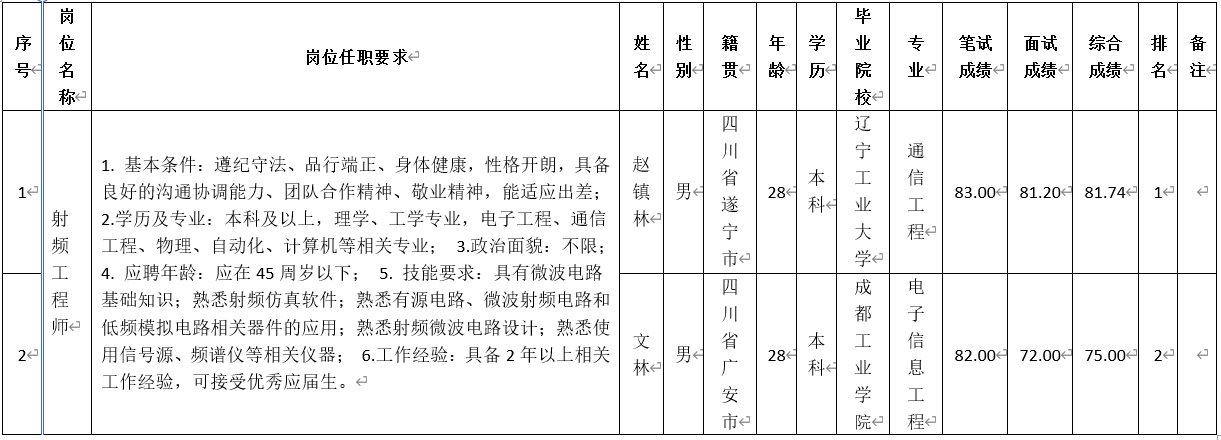 根据成都九洲迪飞科技有限责任公司发布的招聘公告及招聘相关规定,现将测试成绩予以公示。一、招聘成绩