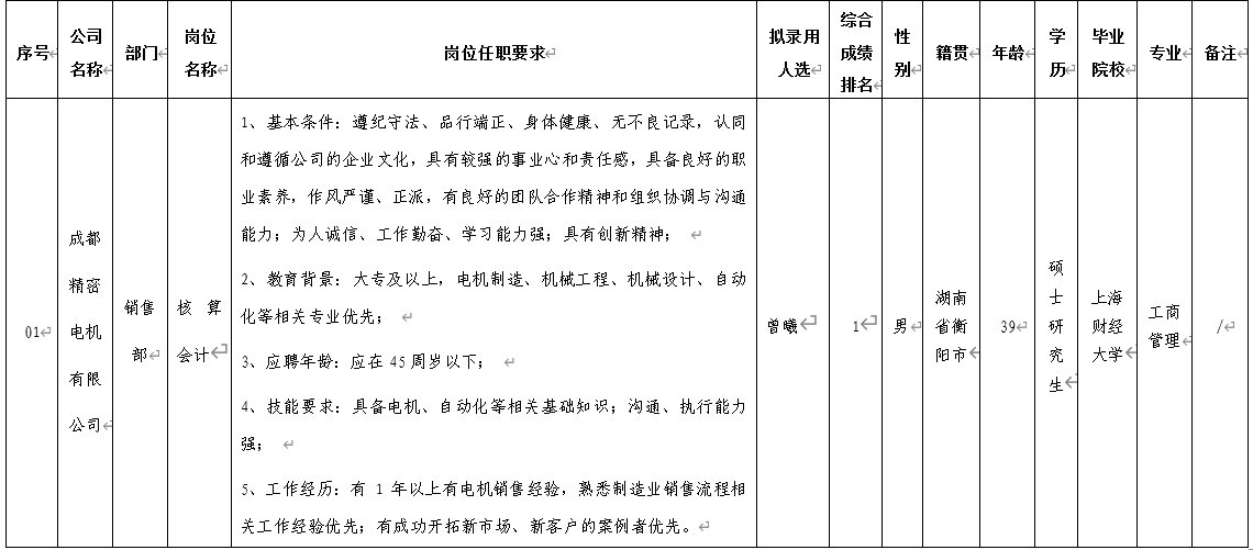 成都精密电机有限公司关于招聘销售经理岗位拟录用人员的公示